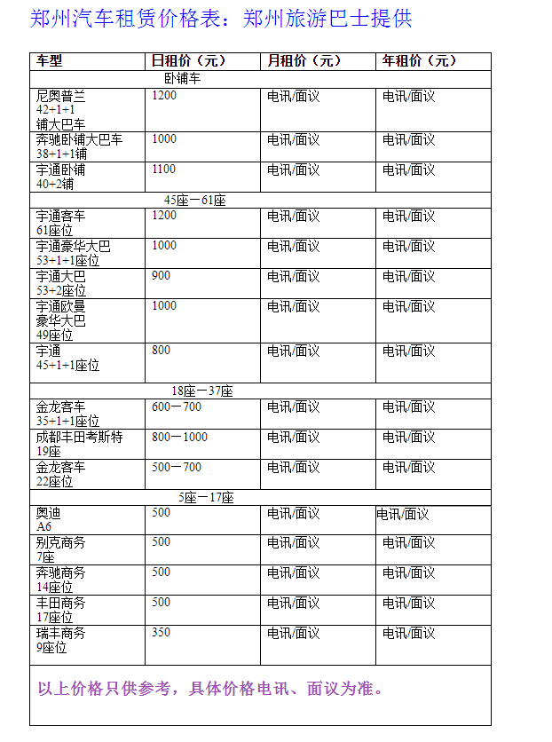 中原旅游巴士車型有:宇通,金龍,61座位,57+2座、53+2座、45+2座、35+2座、33+2座、22+6座、22座位、17座位、豐田考斯特出租17+1+辦公桌,瑞豐商務(wù)、別克商務(wù),小車等等。